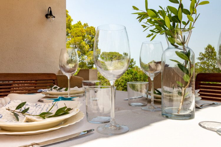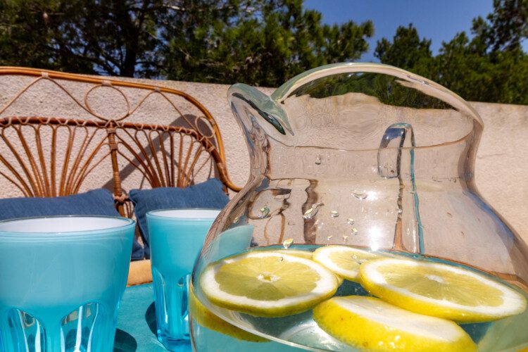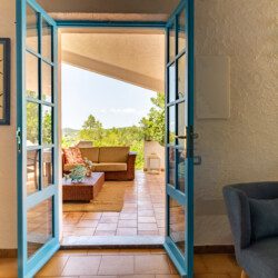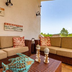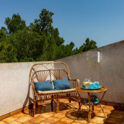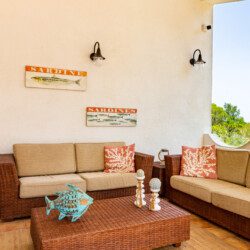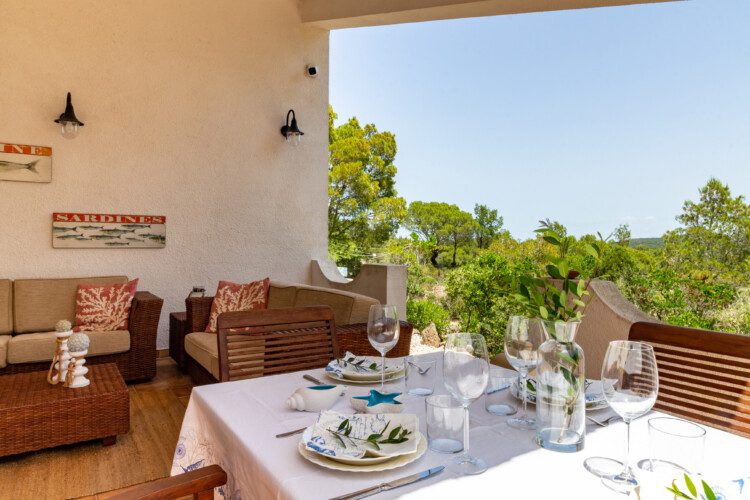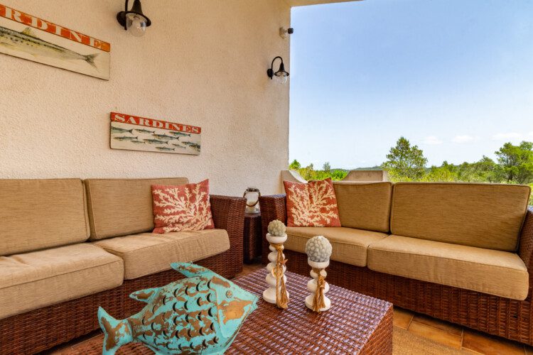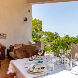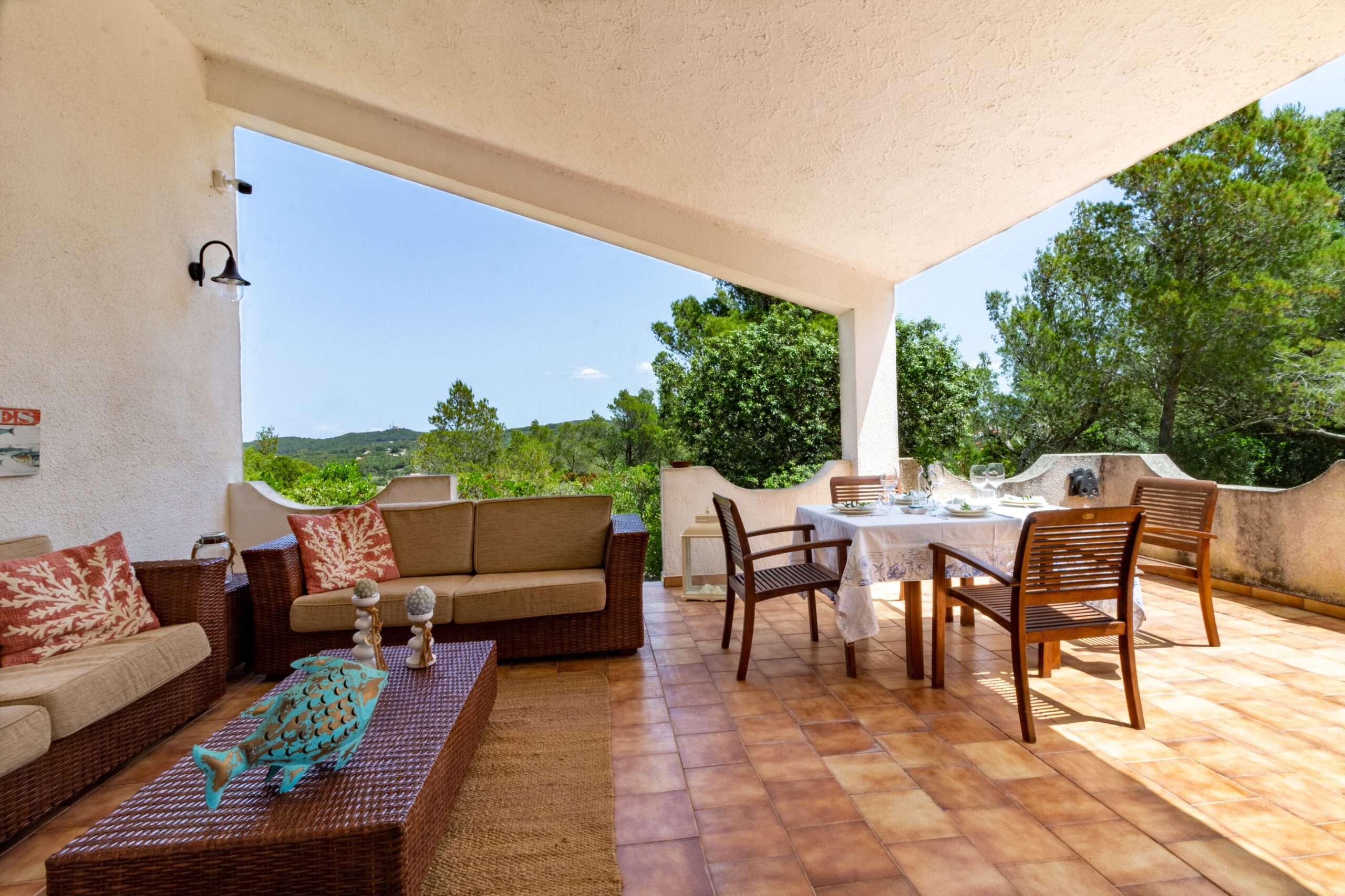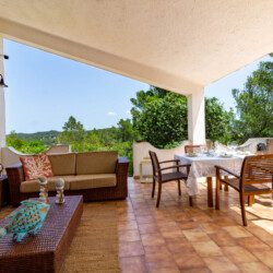Terrazza esterna allestita con tavolo e divanetti.